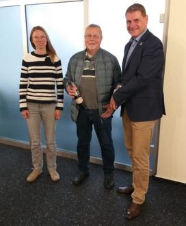 (v. l. Melanie van den Bergh (Abteilung Tourismus), Alfred Hohmann, Bürgermeister Markus Röder)