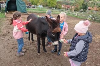 Das von Silke Weiser, Familienzentrum Hofbieber, organisierte und durchgeführte Programm führte die Kinder im Alter von sechs bis zehn Jahren am ersten Tag nach einem kreativen Vormittag im Gemeindezentrum Hofbieber nach Günthers zu den Eseln Max und Moritz. Dort wurden die beiden Esel gestriegelt und geputzt, bevor sich die Gruppe zu einer Eselwanderung auf machte.