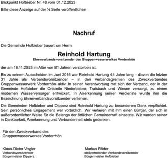 Die Gemeinden Hofbieber und Dipperz sind Reinhold Hartung zu besonderem Dank verpflichtet. Sein persönliches Engagement war vorbildlich. Wir verlieren mit ihm einen Bürger, der sich in
