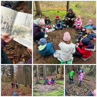 Beim gemeinsamen Frühstück im Zwergenwald stellten sich die Kinder gegenseitig vor und tauschten sich über die jeweiligen Gepflogenheiten aus. Wir stellten fest, dass viele Dinge im Tagesablauf ähnlich sind, wie z.B. das Händewaschen vor dem Frühstück, der Tischspruch, Morgenkreis…. Danach ging es weiter zum Mandalawald und im Anschluss am Waldkindergartenplatz vorbei wieder zum Sportplatz. Nach einem Abschiedslied machten wir uns auf den Weg zurück zu unserem Kindergarten. Unser Fazit für diesen Tag: es ist spannend, was es im Wald alles zu entdecken gibt; wir wurden sehr herzlich aufgenommen und haben viel erfahren; der Weg von unserer Kita bis zum Wald ist sehr steil; es wird einem sehr schnell kalt, wenn man sich nicht genug bewegt; alle sind total nett; es war ein schöner, aber anstrengender Ausflug.