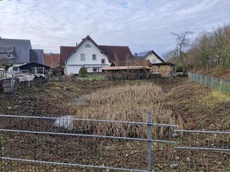 Die Fotos zeigen die Arbeiten an den Regenrückhalteteichen im „Nässefeld“ im Ortsteil Hofbieber.