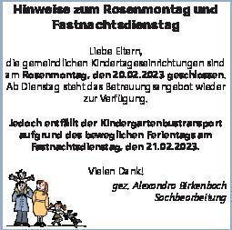 Kindergartennachrichten - Hinweise zum Rosenmontag und Fastnachtsdienstag