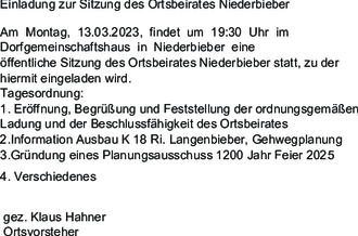 Am Montag, 13.03.2023, findet um 19:30 Uhr im Dorfgemeinschaftshaus in Niederbieber eine öffentliche Sitzung des Ortsbeirates Niederbieber statt, zu der hiermit eingeladen wird.