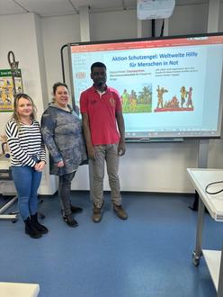 Neben der Wanderausstellung „Brot für die Welt“, die von Referendar Joe Schnirch organisiert wurde, standen den Schülerinnen und Schülern Lernkisten zu den Themen „Faire Mode“, „Gesundheit“ und „Innovationen“ zur Verfügung, die vom Verein „ Gemeinsam für Afrika“ ausgeliehen wurden. Um ein authentisches und verlässliches Bild des großen Kontinents zu erhalten und über den Tellerrand hinauszublicken zu können, konnte mit Dr. Christian Ndala ein Missio-Religionspädagoge gewonnen werden, der eine Woche lang die Klassen in ihrer Arbeit begleitete. „Fast jede oder jeder von euch hat ein Stück Kongo in der Tasche“, fing Dr. Ndala seine Präsentation an und verdeutlichte den Zusammenhang zwischen Smartphones und dem blutigen Rohstoffkrieg im Kongo. „Wir konsumieren, aber die Afrikaner bezahlen dafür einen hohen Preis“, so der Theologe und Soziologe. Zusammen erarbeiteten dann die Lerngruppen die Ursachen sozialer Ungerechtigkeit, die Ursachen für Flucht und Vertreibung und die weltweiten Menschenrechtsverletzungen. Unterstützt von den Referendarinnen Jana Schneidmüller und Clara Deis wurden informative Gespräche geführt und diskutiert. „Vieles ist für uns selbstverständlich geworden, sodass wir gar nicht mehr schätzen können, wie glücklich wir sind“, merkte eine Schülerin betroffen an und viele fragten nach Abhilfe dieser Schieflage. Dr. Christian Ndala weist in diesem Zusammenhang auf Missios Aktion „Schutzengel“ und auf die Kampagne „Saubere Handys“ hin. Danach beschließen die Schülerinnen und Schüler spontan Sammelboxen für benutzte, ausrangierte und kaputte Handys und Smartphones in der Schule zu basteln, um diese dann als Rohstoffquelle zum Recyceln für Missio zur Verfügung zu stellen. Somit kann die gesamte Schulgemeinde ihren persönlichen Beitrag zum Schutz der Umwelt leisten. „Für uns als Schulgemeinde ist es wichtig, globale Zusammenhänge zu verstehen, fair zu leben und an zukünftige Generationen zu denken. Mehr Bewusstsein führt zu mehr Verantwortung und eine andere, weltoffenere Sichtweise hilft uns Menschen, andere besser zu verstehen. Wenn wir dieses unseren Schülerinnen und Schülern mit auf den Weg geben können, haben wir sehr viel erreicht“, so die Kulturschulkoordinatorin Konstanze Korth-Neumann nach Abschluss der Projektwoche.