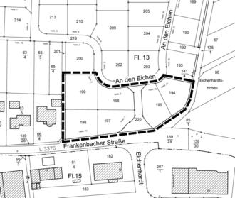 Die Flächen des Geltungsbereiches, rd. 0,6 ha, liegen vollständig innerhalb des rechtskräfti-gen Bebauungsplanes „Eichenhardtsboden“, in der Gemarkung Erda, am westlichen Ortsaus-gang und nördlich der Frankenbacher Straße, im Flur 13, Gewannbezeichnung „Eichenhardts-boden“.