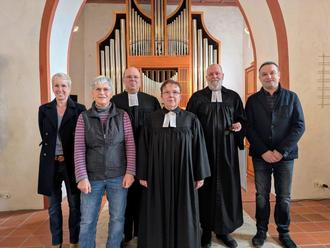 Die neue Prädikantin Ortrud Pinschmidt umrahmt von Superintendent Dr. Harmut Sitzler, Pfarrer Andreas Hagel sowie Mitgliedern des Presbyteriums.
