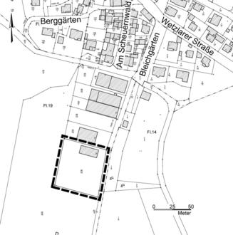 Der Geltungsbereich liegt am südlichen Ortsrand von Hohensolms am südlichen Ende der Straße „Bleichgärten“.
