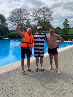 Um diesem Tag eine fröhliche Note zu geben, hatten die beiden Vorsitzenden des neu gegründeten Schwimmbad - Fördervereins Hohenahr (FSH) - Olaf Mortan und Edgar Brück eine außergewöhnliche Idee: unter dem Motto ‚Das Battle - Der Schwimmer, der Springer und der Meister‘ sollte ein Wettkampf der besonderen Art stattfinden! Olaf Mortan (70) wettete, dass er 50 m Delphin schneller schwimmen könne, als Edgar Brück (74) 3-mal einen Salto vom Dreier machen könne.