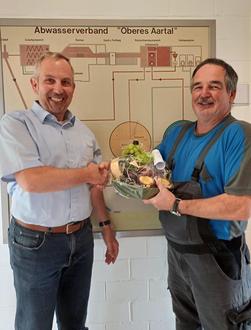 Der dienstälteste Mitarbeiter Wolfram Ax „klärt“ inzwischen seit 30 Jahren für den Abwasserverband Oberes Aartal. Zur Anerkennung überreichte Verbandsvorsteher, Bürgermeister Markus Ebertz, zum 30-jährigen Jubiläum eine Urkunde und einen Präsentkorb.