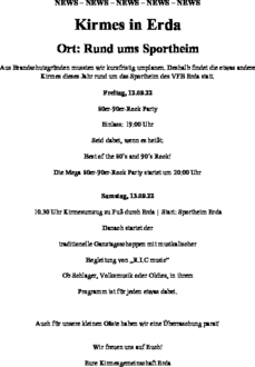 Aus Brandschutzgründen mussten wir kurzfristig umplanen. Deshalb findet die etwas andere Kirmes dieses Jahr rund um das Sportheim des VFB Erda statt.