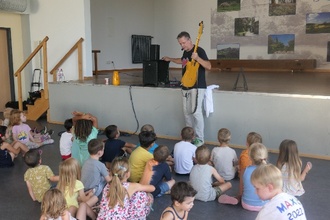 Für die Kinder war es ein absolut aufregender und toller Vormittag! Im großen Saal des DGH Hohensolms erlebten die Kinder ein bewegungsreiches Mitmachkonzert. Viele bekannte Kinderlieder, wie die „Affen rasen durch den Wald“, „Aramsamsam“ oder das „Fliegerlied“ wurden dabei lautstark mitgesungen und natürlich auch dazu getanzt. Nicht nur durch die hohen Temperaturen waren nachher alle durchgeschwitzt und geschafft. Im Anschluss hat sich Herr Pfeiffer auch noch Zeit für die vielen Kinderfragen genommen, die er geduldig beantwortet hat.