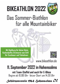 Am Sonntag, dem 11. September 2022, veranstaltet der Schützenverein 1964 Hohensolms e.V. seinen 16. Bikeathlon (Fahrradfahren und Luftgewehrschießen) für alle Mountain-Biker ab 12 Jahre. In diesem Jahr wieder mit E-Bike Klasse und dem Staffel-Wettbewerb (3er Team).