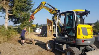 Nachdem die Spielkombination montiert war, haben die Bauhofmitarbeiter die Geländemodellierungen vorgenommen und den Fallschutzbereich mit Holzhackschnitzel gefüllt.
