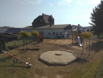 Das Bauhofteam hat den neuen Sandbereich mit Holzstämmen eingefasst und das vorhandene Spielhaus auf eine 'Anhöhe' verlegt.