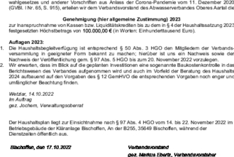 Die Haushaltsbegleitverfügung ist entsprechend § 50 Abs. 3 HGO den Mitgliedern der Verbandsversammlung in geeigneter Form bekannt zu machen; hierüber ist uns ein Nachweis sowie der Nachweis der Veröffentlichung gem. § 97 Abs. 5 HGO bis zum 20. November 2022 vorzulegen.