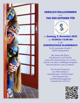 der Übergang in eine weiterführende Schule und der Wechsel in eine neue Schulform sind ein großer Schritt für Schülerinnen und Schüler und ihre Eltern. Um Ihnen und Euch die Entscheidung für eine geeignete Schule zu erleichtern, öffnet die EUROPASCHULE GLADENBACH am 5. November 2022 von 10.00 bis 13.00 Uhr ihre Türen und gibt somit allen interessierten Schüler*innen und Eltern die Gelegenheit, unsere Schule in ihrer Vielfältigkeit kennenzulernen und zu entdecken.