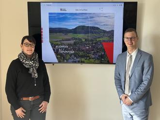 Die Verwaltungsangestellte Kerstin Hugo-Rudolph (links) und Bürgermeister Andre Stenda präsentieren den neuen Internetauftritt der Gemeinde Hohenroda.