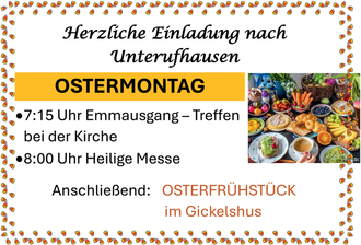 An Ostermontag startet der traditionelle Emmausgang nach Unterufhausen um 07.15 Uhr an der Kirche in Ufhausen. Im Anschluss an die Heilige Messe um 8 Uhr in Unterufhausen gibt es ein Osterfrühstück im Gickelshus.