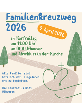 In Ufhausen startet der Familienkreuzweg am Karfreitag, 03. April 2026, um 11 Uhr am DGH Ufhausen und schließt in der Kirche ab.