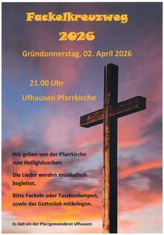 | Ufhausen | 21:00 Uhr | Fackelkreuzweg durch die Natur - betend bis zum Heilighäuschen |