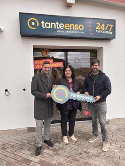 Schlüsselübergabe an Tante Enso: Bürgermeister Andre Stenda (links) und Bauamtsleiter Patrick Pingitzer (rechts) übergeben symbolisch den Schlüssel für den neuen Tante Enso-Markt an Expansionsmanagerin Annchen Fleger.