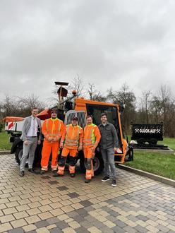 Bürgermeister Andre Stenda (links) und Bauamtsleiter Patrick Pingitzer (Rechts) übergeben den neuen Geräteträger an das Team vom gemeindlichen Bauhof.