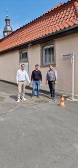 Bürgermeister Andre Stenda und Bauamtsleiter Patrick Pingitzer (von links) inspizieren gemeinsam mit Uwe Eidam von der bauausführenden Firma BABILIT GmbH die Schlaglöcher in den Straßen.