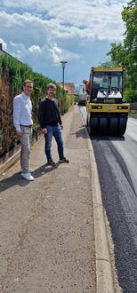 Die Schlaglöcher und Risse sollen mit dem Straßenunterhaltungsprogramm beseitigt werden. Hier begutachten Bürgermeister Andre Stenda und Bauamtsleiter Patrick Pingitzer die Arbeiten des ersten Arbeitsgangs der Firma Babilit.