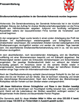 In den vergangenen Tagen wurde bereits in einem ersten Arbeitsgang das Profil der Straßen mit Asphaltmischgut wiederhergestellt und Schlaglöcher sowie Unebenheiten verschlossen. Die vorbereiteten Arbeiten konnten weitestgehend ohne Straßensperrungen durchgeführt werden und werden die nächsten Tage beendet sein. Die abschließende Straßenoberflächenbehandlung wird in ca. vier bis sechs Wochen durchgeführt.