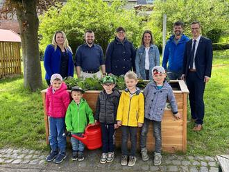 Maria Prudlak und Andre Jüttner von der EAM übergeben ein Hochbeet an den Kindergarten „Pfiffikus“ in Ausbach mit Erzieherin Doreen Kümmel und Kindergartenleiterin Nadine Köhler-Fey sowie Bauamtsleiter Patrick Pingitzer und Bürgermeister Andre Stenda (hintere Reihe von links). Die Kinder zeigen sich darüber ebenfalls sehr erfreut.