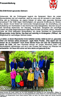 Hohenroda. Mit der Frühlingszeit beginnt die Gartenzeit. Wenn die ersten Sonnenstrahlen die Luft erwärmen, zieht es Jung und Alt vermehrt in den Garten. Was gibt es Schöneres, als eigene Kräuter zu sähen oder gesundes Gemüse anzubauen? Der EAM liegen Nachhaltigkeit und gesunde Ernährung am Herzen. Aus diesem Grund fördert der kommunale Energieversorger die Anschaffung und Aufstellung von Hochbeeten in den Kommunen ihres Netzgebietes. Darunter ist auch die Gemeinde Hohenroda: Am Dienstag, 16.05.2023, übergaben die zukünftige Leiterin des EAM Regionalzentrums Mitte Maria Prudlak und Andre Jüttner, Vertreter Leiter der EAM Netzregion Borken/Bebra, ein neues Hochbeet an Hohenrodas Bürgermeister Andre Stenda. Das Beet soll zukünftig im Kindergarten „Pfiffikus“, die Möglichkeit für nachhaltiges Gärtnern bieten.