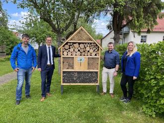 Maria Prudlak und Andre Jüttner (von rechts) von der EAM übergeben ein Insektenhotel an Bauamtsleiter Patrick Pingitzer und Bürgermeister Andre Stenda (von links).