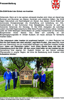 „Der Lebensraum vieler Insekten ist zunehmend bedroht - in vielen Regionen hat sich ihre Zahl bereits sehr stark reduziert“, sagt Maria Prudlak. „Das neue XXL-Hotel soll zum Artenschutz und zur Artenvielfalt beitragen und nützlichen Insekten künftig beim Nisten und Überwintern helfen.“ Auch Andre Stenda freute sich über die Unterstützung durch die EAM: „Mit dem neuen Hotel helfen wir den Insekten bei der Vermehrung ihrer eigenen Art. Zugleich fördern wir den Schutz wichtiger Pflanzenarten in unserer Region, die ohne die Bestäubung durch Insekten nicht fortbestehen könnten.“
