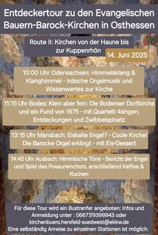 | 10:00 – 16:00 Uhr | Entdeckertour Barocke Dorfkirchen in Odensachsen, Bodes, Mansbach und in Ausbach (Pfr. Funk, Pfr. Krüger, Posaunenchor Schenklengsfeld, Pfrin. Becker) |