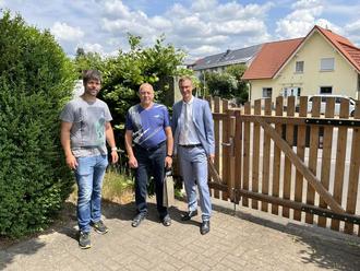 Bauamtsleiter Patrick Pingitzer (links) und Bürgermeister Andre Stenda (rechts) bedanken sich vor dem neuen Eingangstor zum Friedhof Oberbreitzbach bei dem Erbauer Karl-Heinz Madus für sein außerordentliches Engagement.