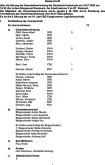 | Beschluss: | Die Gemeindevertretung beschließt den 1. Nachtrag zur Hauptsatzung der Gemeinde Hohenroda in der dem Beschlussvorschlag beigefügten Fassung mit folgenden Änderungen zu beschließen: |