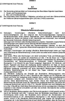 | (1) | Satzungen, Verordnungen, öffentliche Bekanntmachungen nach dem Kommunalwahlgesetz und den aufgrund des Kommunalwahlgesetzes ergangenen Rechtsverordnungen sowie anderer Gegenstände, deren öffentliche Bekanntmachung erforderlich ist, werden mit Abdruck in den „Nachrichten aus Hohenroda“, dem Amtsblatt der Gemeinde Hohenroda, öffentlich bekannt gemacht. Satzungen sind mit ihrem vollen Wortlaut bekannt zu machen. Gesetzlich vorgeschriebene Genehmigungen sind zugleich mit der Satzung öffentlich bekannt zu machen. Die Bekanntmachung ist mit Ablauf des Erscheinungstages vollendet, an dem die Ausgabe des in Satz 1 genannten Bekanntmachungsorgans den bekannt zu machenden Text enthält. |