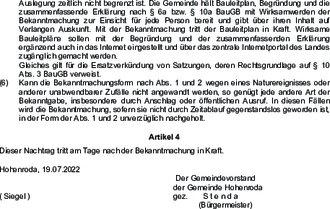 | (3) | Erläuterungen bekannt zu machen, so werden sie abweichend von Abs. 1 für die Dauer von 7 Tage Arbeitstagen, wenn gesetzlich nicht ein anderer Zeitraum vorgeschrieben ist, während der Dienststunden der Gemeindeverwaltung in Hohenroda, Ortsteil Oberbreitzbach, Baumgarten 3 zur Einsicht für jede Person ausgelegt. Gegenstand, Ort (Gebäude und Raum), Tageszeit und Dauer der Auslegung werden spätestens am Tage vor deren Beginn nach Abs. 1 öffentlich bekannt gemacht. Gleiches gilt, wenn eine Rechtsvorschrift öffentliche Auslegung vorschreibt und keine besonderen Bestimmungen enthält. Die öffentliche Bekanntmachung ist mit Ablauf des Tages vollendet, an dem der Auslegungszeitraum endet. |