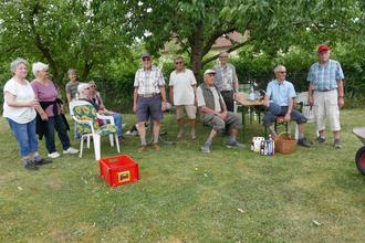 Die Wanderung führte uns von Mansbach, vom Lehnchen 380 m zum Buchenberg 397 m. Vom ehemals Gestütsweg Stall 3 hatten wir schon den ersten Ausblick über Mansbach, die Grasburg, zur Aue mit den Windrädern und Modellflugplatz bis nach Thüringen mit dem Öchsenberg, Dietrichsberg, Ulsterberg und Michelsberg und in weiterer Ferne den Arzberg 573 m mit dem Sendemast, bekannt durch die blaue Scilla. Weiter ging es zum ehemals Plattenweg - Pointalphaweg - der DDR in Richtung Südwest an dem sogenannten Niemannsland (baumlos) entlang. Der Weg führte weiter Richtung Osten bis zum Friedhof Wenigentaft mit dem markierten Ziegeleiweg bis zum ehemaligen Bahnhof Wenigentaft-Mansbach. Zurück nach Mansbach nutzten wir den Radweg R 15. Die gesamte Wegstrecke betrug 9,0 km, bei schönem Wanderwetter und etwas kühleren Temperaturen durch den Buchenberg und Standorfsberg. In Mansbach wurde eine ausgiebige Rast eingelegt.