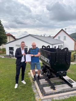 Bürgermeister Andre Stenda (links) übergibt Jürgen Schwab die Ernennungsurkunde zum kommunalen Behindertenbeauftragten der Gemeinde Hohenrod