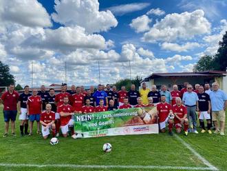 Die Kicker der Nordhessischen Regionalauswahl (rote Trikots) und der Ratsherren Waldhessen (schwarze Trikots) mit dem Fair Play-Banner.