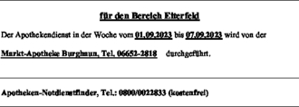 Der Apothekendienst in der Woche vom 01.09.2023 bis 07.09.2023 wird von der Markt-Apotheke Burghaun, Tel. 06652-2818 durchgeführt.
