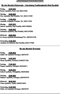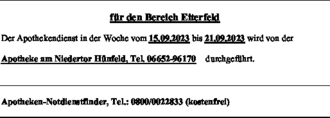 Der Apothekendienst in der Woche vom 15.09.2023 bis 21.09.2023 wird von der Apotheke am Niedertor Hünfeld, Tel. 06652-96170 durchgeführt.