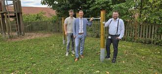 André Jüttner, Vertreter Leiter der EAM Netzregion Borken/Bebra, übergab nun eine Reckstange an Bürgermeister Andre Stenda und Bauamtsleiter Patrick Pingitzer der Gemeinde Hohenroda. Das Sportgerät wurde auf dem Spielplatz im Ortsteil Ausbach installiert und lädt zur aktiven Nutzung ein.