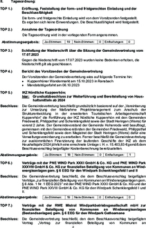 Die Gemeindevertretung beschließt, die dem Beschlussvorschlag beigefügten Verträge „zur finanziellen Beteiligung von Kommunen an Windenergieanlagen gem. § 6 Abs. 1 Nr. 1 EEG 2023“ mit der PNE WIND Park XXXI GmbH & Co. KG und der PNE WIND Park XXVIII GmbH & Co. KG für den Windpark Schenklengsfeld I und II.