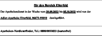 Der Apothekendienst in der Woche vom 29.09.2023 bis 05.10.2023 wird von der Adler-Apotheke Eiterfeld, 06672-92010 durchgeführt.