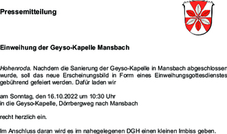 Hohenroda. Nachdem die Sanierung der Geyso-Kapelle in Mansbach abgeschlossen wurde, soll das neue Erscheinungsbild in Form eines Einweihungsgottesdienstes gebührend gefeiert werden. Dafür laden wir