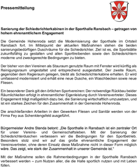 Ein besonderer Dank gilt den örtlichen Sportvereinen: Der notwendige Rückbau beider Räumlichkeiten erfolgt in ehrenamtlicher Eigenleistung durch Vereinsvertreter. Dieses Engagement trägt maßgeblich dazu bei, die Sanierung wirtschaftlich umzusetzen, und ist ein starkes Zeichen für den Zusammenhalt in der Gemeinde Hohenroda.