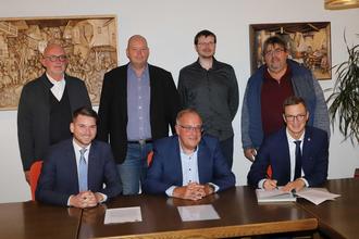 Die Vereinbarung wird unterzeichnet, vorne von links: Die Bürgermeister Julian Kempka (Friedewald), Wilfried Hagemann (Ludwigsau) und Andre Stenda (Hohenroda). Dahinter von links: Bernd Stahl (Friedewald), Markus Sauerwein (Ludwigsau), Matthias Dörre (Gemeindeverwaltung Ludwigsau) und Ferdinand Schwab (Hohenroda).