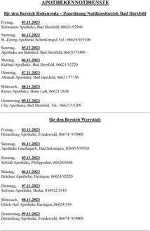 Der Apothekendienst in der Woche vom 03.11.2023 bis 09.11.2023 wird von der Apotheke am Niedertor Hünfeld, Tel.: 06652-96170 durchgeführt.